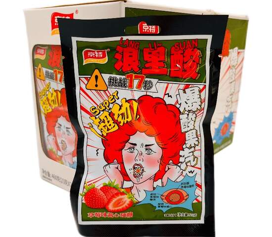 Карамель в кислой обсыпке, в самом центре конфеты идет шипучка. Попробуйте яркий вкус этой карамели со вкусом клубники.Цена указана за 1 штуку.